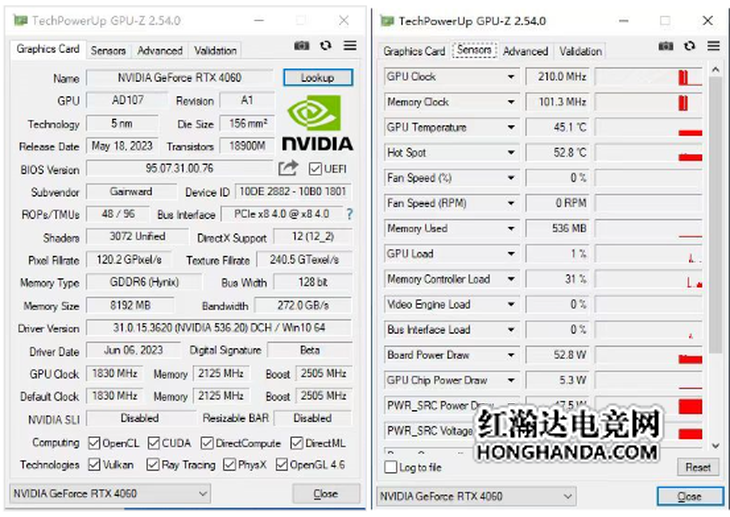 通过更新至新的GPU Z 2.5.4版本,玩家们可以得到耕升 GeForce RTX 4060 追风中更为具体的参数表现和实际规格,通过数据我们可以看到耕升 GeForce RTX 4060 追风在待机温度下温度为45.1°C,功耗为7.68W。