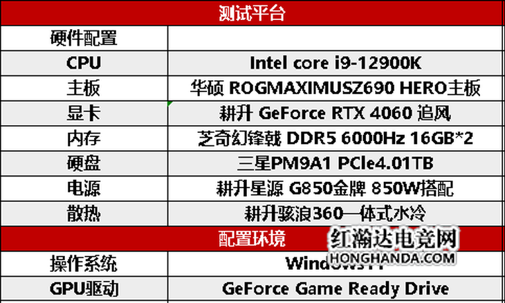 本次测试环节使用了Intel Core i9-12900K,主板方面选择了十分全面的ROG MAXIMUS Z690 HERO主板,内存方面启用2条芝奇 幻锋戟 DDR5 6000Hz 16GB,电源采用的是 耕升 星源 G850金牌 850W,散热方面则是 耕升 骇浪360 一体式水冷,这套散热配置可以为GPU提供足够的降温以及供电 ,这套配置在正常使用中,足以跑满耕升 GeForce RTX 4060 追风的全部性能,同时本次测试将同时与GeForce RTX 3060 12GB和GeForce RTX 2060 进行直接比对,让我们来看看耕升 GeForce RTX 4060 追风的优越表现吧。
