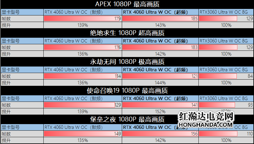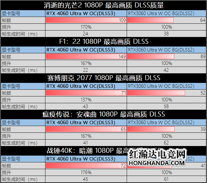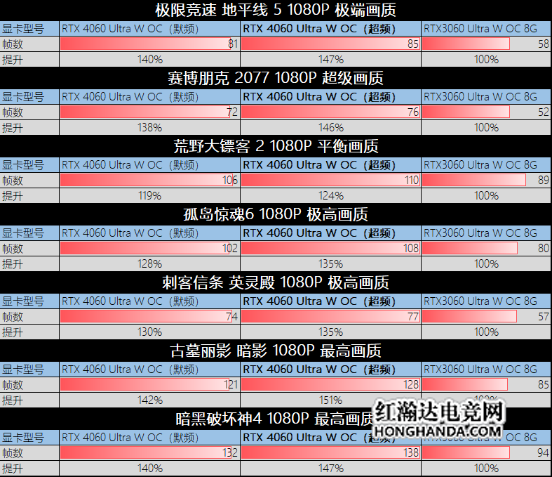游戏实测方面,RTX 4060 Ultra W OC显卡在传统光栅性能中提升同样巨大。实测的7款单机游戏中,相比较RTX3060 8G,帧数最低提升19%,最高提升51%。