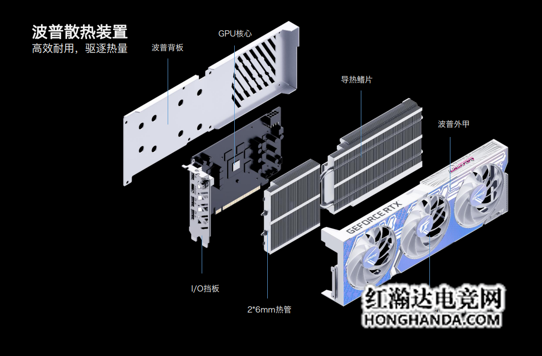 此卡延续了主白色底色,其正面采用了大块渐变设计,随着光线的变化展现出多彩的色彩效果。而iGame Logo和圆形波点元素作为图案底纹,为显卡增添了更加丰富的视觉呈现。这种设计突破了传统显卡造型的常规,创造出与众不同的外观设计,让每一张显卡都追求最具个性化的表达方式,打造与众不同的波普风格硬件。
