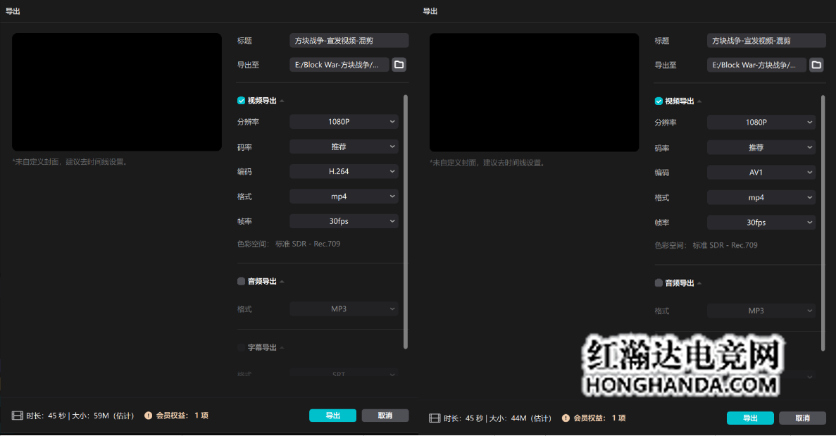 本次AV1编码测试选择了剪映专业版,以输出H.264 /AV1两种编码格式的视频进行对比。实测45s视频输出,AV1格式比H.264格式视频体积缩小25%,用时也仅用12s即可完成。