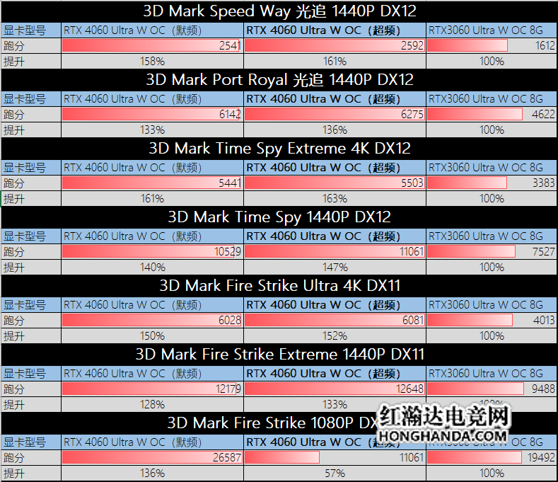 显卡好不好,还要看硬实力。3D Mark基础测试中,RTX 4060 Ultra W OC显卡相较RTX 3060 Ultra W OC 8G有非常大的提升,具体如下(默频、超频):