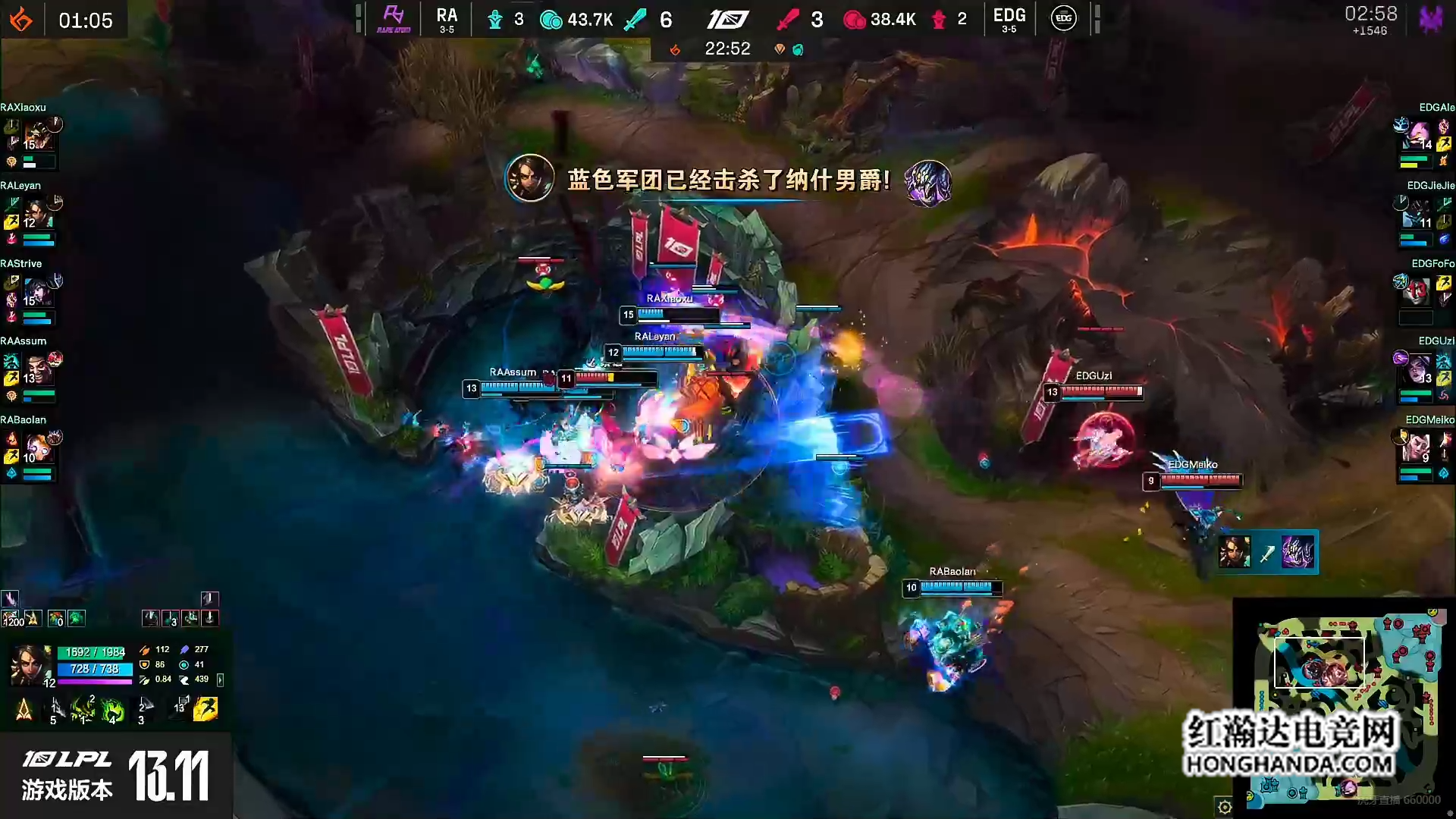 RA仅剩一个卡莎,根本无法防守高地,被EDG破掉两路高地。37分钟的小龙团上,EDG大获全胜,直接一波结束比赛。