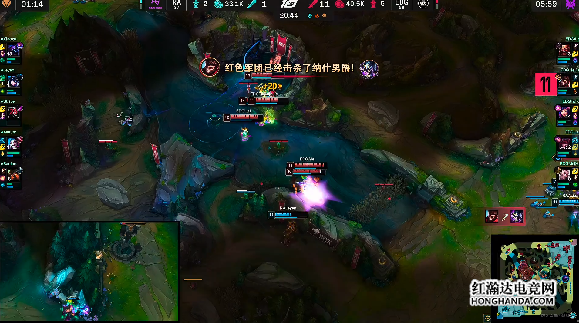 在20分钟大龙刷新的时候,EDG找到机会将RA的双C击杀,两队之间的差距越来越大,EDG的正面推进,随便开团。反观RA装备劣势根本没法防守带大龙buff的EDG。