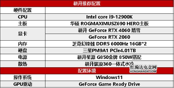 为发挥出显卡的全部性能,本次测试采用了强劲的Intel core i9-12900K进行搭配。主板方面选择了ROG MAXIMUS Z690 HERO主板,内存方面启用2条芝奇 幻锋戟 DDR5 6000Hz 16GB,电源采用的是 耕升 星源 G850金牌 850W。这套使用耕升硬件为搭配的测试平台,在各方面都满足了测试的使用,耕升 GeForce RTX 4060 踏雪的性能也将在该测试平台下得到完美表现。