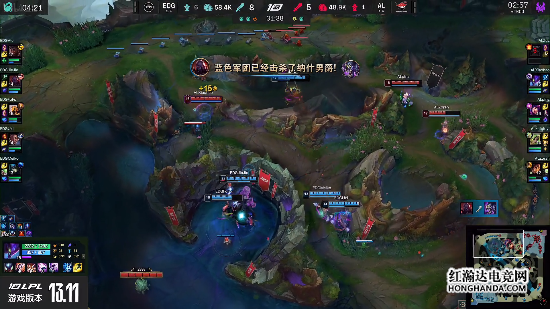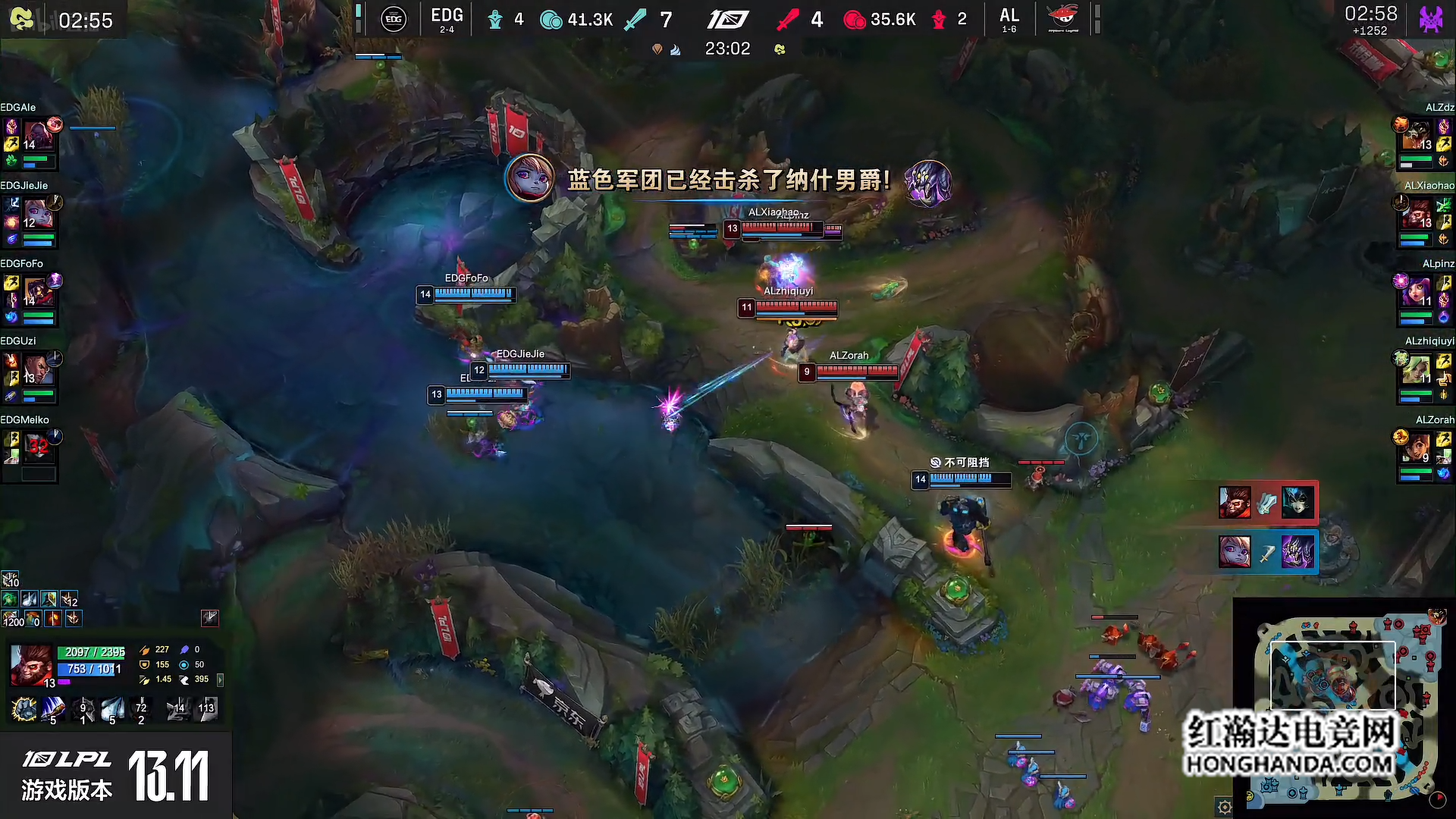 13分钟第二条小龙团,两队来到下路,AL的妮蔻换掉了EDG的波比。随后先锋团AL拿到先锋但是自己家的上路惨遭阵亡。