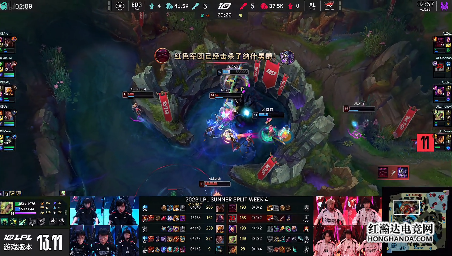 来到20分钟小龙团,EDG的第三条小龙,AL这边选择与EDG争,AL的猴子绕后开团虽然拿到小龙,但是却牺牲了妮蔻。23分钟EDG快速的rush掉大龙,AL赶来之留下了娜美。