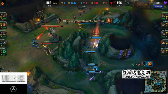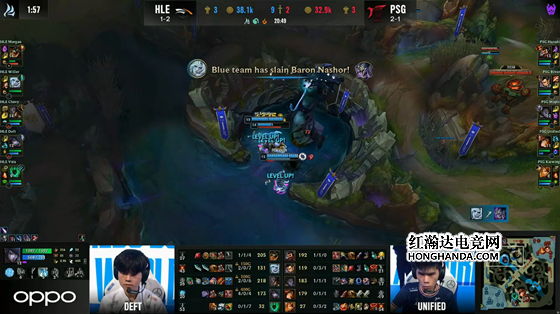 在听牌龙团战中HLE完美包夹分散了PSG的注意力,拿下小龙后追击开团将PSG团灭,基本确立了胜势。接下来PSG还要在上半区不断面对HLE从大龙区展开的压迫。他们选择以攻为守先手秒掉锤石,但为此交掉了四个大招,HLE见状直接开团击杀赵信,PSG无力抵挡集体溃败,HLE转头拿下了大龙Buff。
