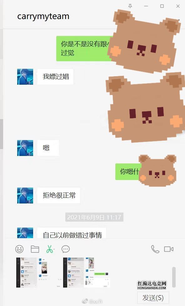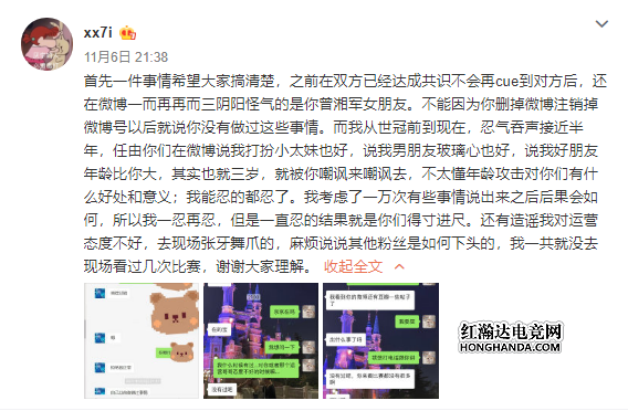 在几个小时后该账号再次发文表示对方经常在微博阴阳怪气她,他文中指出这位前滔搏的工作人员和他的朋友也就是湘军的前女友经常在网上阴阳怪气她,已经忍了半年之久,忍无可忍才会将事情爆出来,并且在配图中贴出了湘军和教练CarryMyTeam的聊天记录,其中湘军承认自己PC。