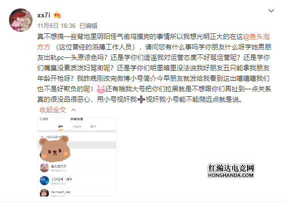 昨天下午,一社交媒体账号公开表示了不满,在文博内容中可以确认此账号的拥有者是长沙TES.A的边路选手苏沫的女友,在博文中直接@出了另一账号,称其是滔搏的前工作人员,字里行间各种质问,从文中可以看出,她与@出的这账号,和她的朋友,以及他朋友的男朋友有着不小的矛盾,并表示这位“男朋友”PC,在配图中把该用户和长沙TES.A的湘军都屏蔽了。