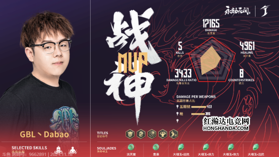 本场比赛战神给到了GBL丶DABAO,虽然未能战到最后,不过决赛圈中他大佛的表现非常亮眼,战神之名实至名归。