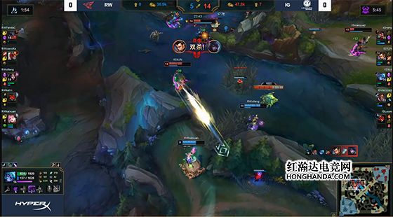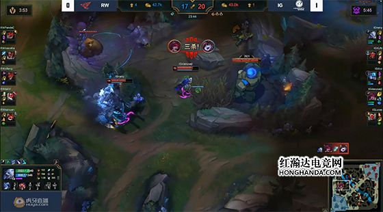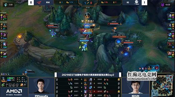 开局RW全员强势入侵iG的蓝buff野区,千珏被压低了血量被迫OB,薇古丝则在蓝buff左侧黏住了辛德拉,霞孤身绕后试图和薇古丝击杀辛德拉,但自己和队友脱节,RW反而由奥拉夫收掉霞的一血。