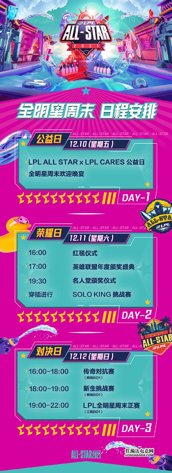 本次全明星周末将为期3天,分别为公益日、荣耀日以及对决日。12月10日是LPL ALLSTAR x LPL Cares的主题公益日,我们将进一步拓展公益与地区之间的合作。12月11日,全明星周末的荣耀日,嘉宾红毯仪式、英雄联盟年度颁奖盛典及名人堂颁奖仪式将于当天举办,同时SOLO KING挑战赛也会于当日穿插举行。而12月12日的对决日中,新生挑战赛、传奇对抗赛以及全明星周末正赛三项重磅赛事都将在此日举办。