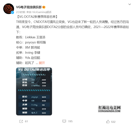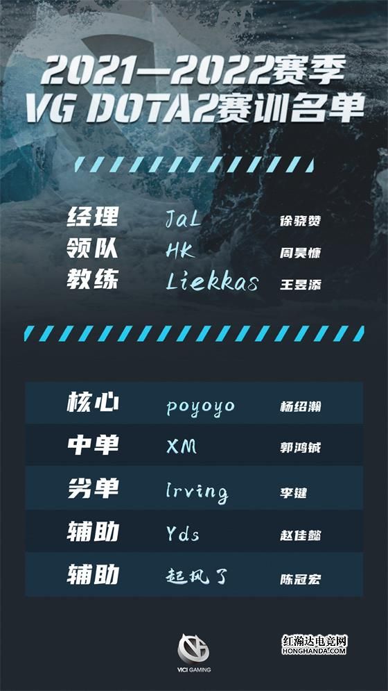 TI结束至今,CNDOTA可谓风云变换,VG也迎来了新一轮的人员调整。经过各方的沟通,VG电子竞技俱乐部DOTA2分部的全部人员均已确定,2021—2022年赛季阵容如下: