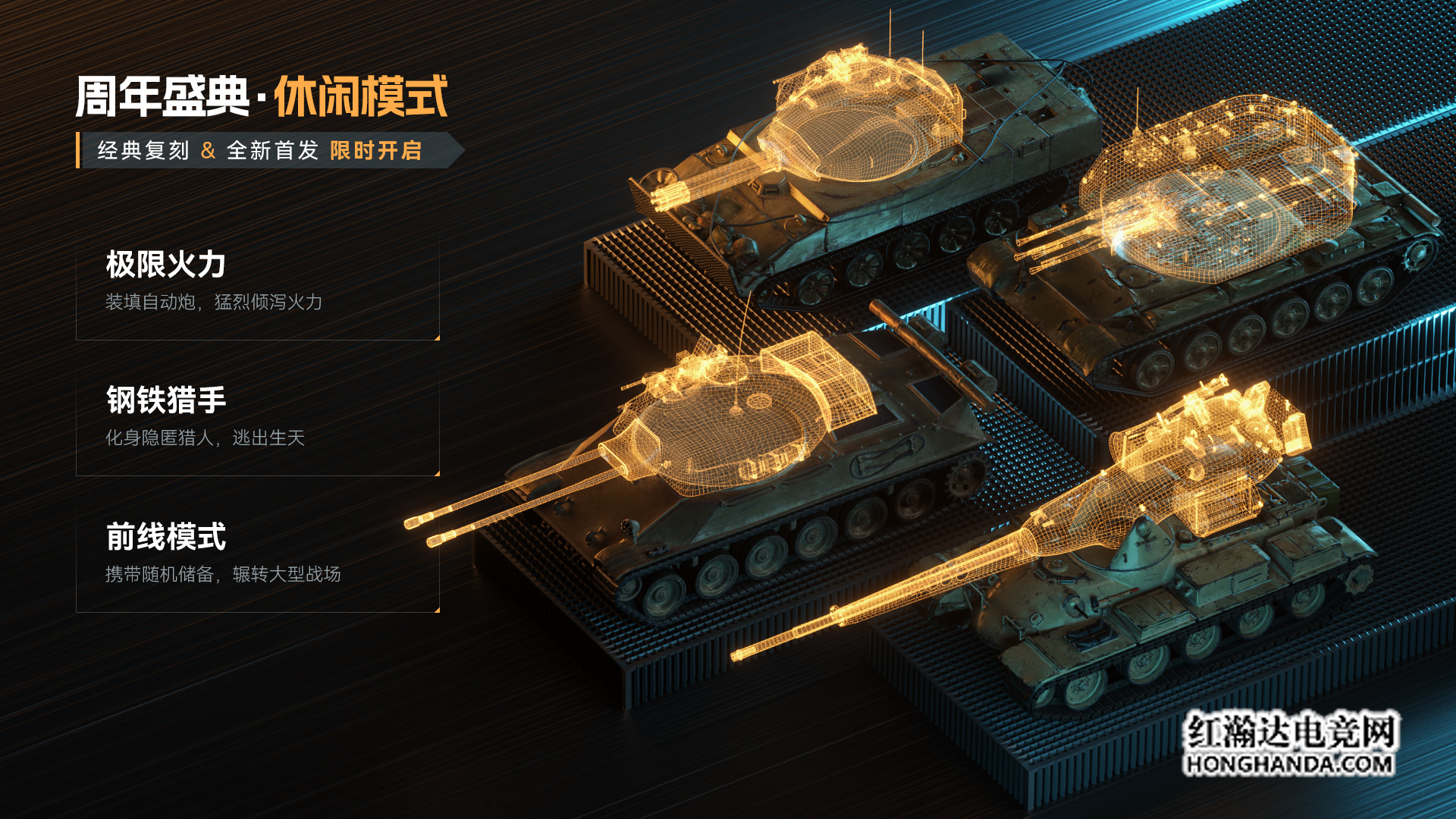 随着周年纪念开启,多种新玩法将陆续降临《坦克世界》。趣味模式——“极限火力”将率先登场,体验奇特的坦克组装方式,8辆改装了自动炮的坦克,将在这一模式中与指挥官们见面。此外“钢铁猎手”模式和带有全新机制的“前线模式”也将在周年活动期间上线。