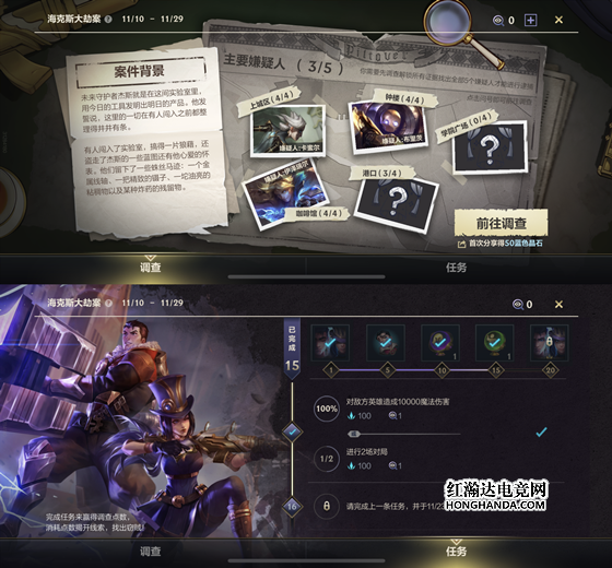 尤其是在英雄联盟手游的“海克斯大劫案”活动里,玩家可以通过参与活动的方式参与到专属剧情中来。万众瞩目的天才发明家杰斯的实验室遭到洗劫,现场留下了许多疑似嫌疑人的相关证据,玩家通过进行游戏达成目标就可以逐个解锁线索,缩小嫌疑人范围,最终调查出事情的真相。这与其他传统的“玩游戏拿奖励”的活动非常不同,玩家在一条条线索抽丝剥茧的过程里还能够体验到侦探断案的快乐。而这些线索所指向的嫌疑人也都是大家所熟悉的游戏中的英雄。