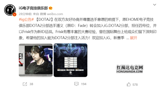 【DOTA2】在双方友好协商并尊重选手意愿的前提下,原EHOME电子竞技俱乐部DOTA2分部选手潘义(原ID:Fade)转会加入iG.DOTA2分部,担任四号位,并以Frisk作为新ID征战。Frisk有着丰富的大赛经验,曾在国际舞台上给观众们留下深刻印象,希望他的加入能为DOTA2分部注入活力!欢迎加入iG,新赛季一起加油!