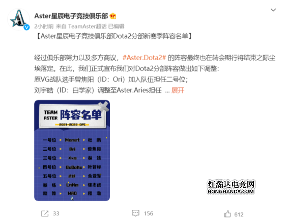 北京时间11月21日,Aster战队官宣他们DOTA2分部新赛季阵容名单。早些时候公告了Ori加盟的消息,原二号位选手白学家调整至青茶Aries,并引入Aries五号位皮球。