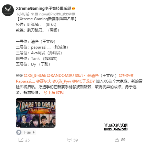 感谢@XG_叶孤城 @RANDOM跳刀跳刀丶@清净(王文俊 )@拒绝者Paparazi灬 @瑟尔夫 @Xjh_Pyw @MC子龙DY 加入XG这个大家庭。新的冒险即将启航,愿选手们在新赛季能够披荆斩棘,取得优异的成绩。勇于逐梦,超越极限