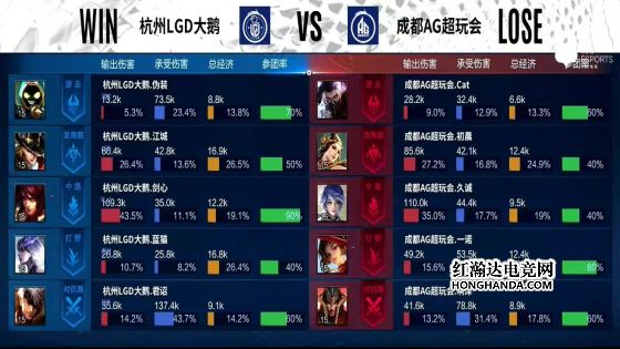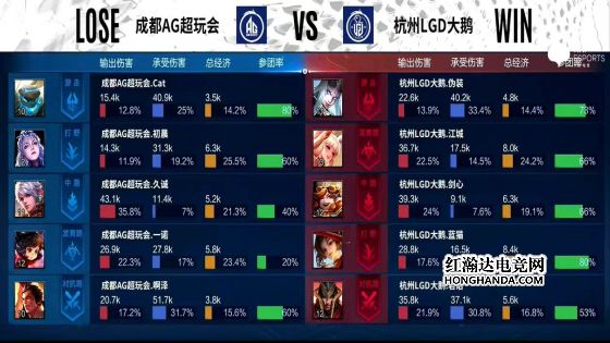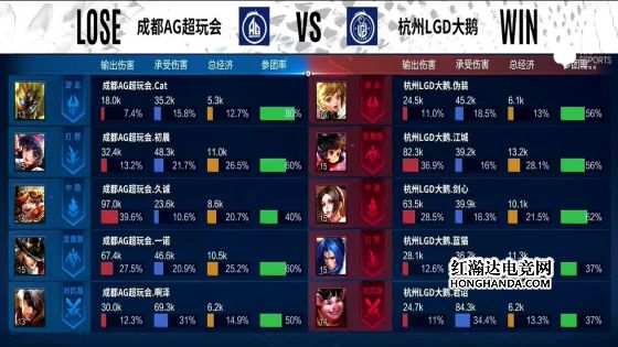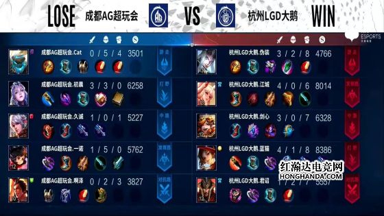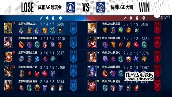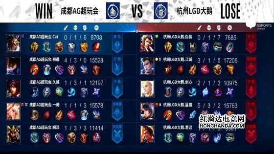 6分半,云缨拉死无闪现的李元芳,7分20秒,东皇太一咬中盾山,露娜进场二连击破,坦度不足被江城公孙离点死,8分半,云缨拿下暴君,AG外塔全部被破。9分钟,AG中路高地被破,李元芳上头二技能被东皇太一咬中,李元芳瞬间蒸发,露娜再次被公孙离点死,啊泽吕布无经济落地成盒,久诚百里守约只能在泉水甩狙,LGD推掉敌方水晶,战胜AG。本局最佳给到杭州LGD大鹅.伪装的东皇太一