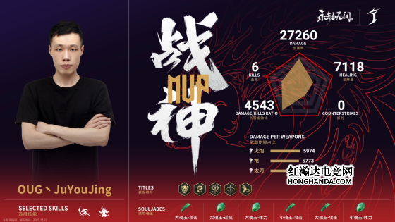 本局战神给到了OUG丶JuYouJing。2万7的伤害外加6次击杀,帮助OUG带来一场关键胜利。