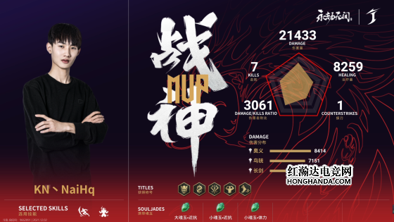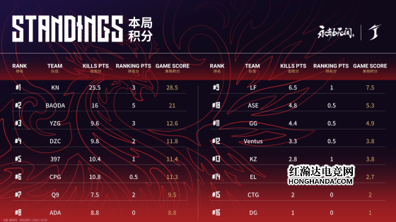 本局战神给到了KN丶NaiHq。虽然KN战队未能斩获荣光,不过第二名的名次以及高额的击杀分数让KN战队首局拿到了28.5的分数,打出2万1伤害以及7次击败的NaiHq功不可没。