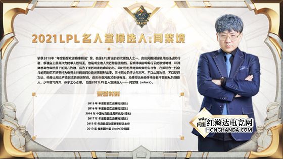 斩获2018年“年度最受欢迎赛事解说”奖,他是LPL解说的初代领路人之一,肩挑风雨背披星月的征战同行者,解说台上最具张力的单人控场王,也是成全他人光芒的最佳拍档。召唤师峡谷响喝行云的激情呐喊,和洲际赛舞台潸然落下的男儿热泪,成为了无数玩家的青春记忆。同时他也是电竞教育的先行者,在解说台一线奋斗的同时仍不断坚持为电竞主持解说岗位输送着新鲜血液。三十而立仍怀少年志气,不以山海为远,不以咫尺为近。他是让观众声临其境的资深解说,语言诙谐风趣又张弛有度。又是帮扶后辈传授经验不曾藏私的领路人。少年意气挥斥,赤子之心永葆。 他是2021LPL名人堂候选人——闫紫境(wAwa)