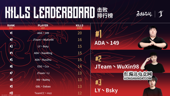 再来看看击败榜,ADA丶149以20次击败数领跑,他无敌的天海大师是ADA获胜的关键。紧随其后的是JTeam丶WuXin98跟LY丶Bsky。