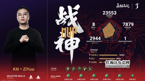 本局比赛战神给到了KN丶ZiYuu。虽然KN战队未能斩获荣光,不过他们超高的击败分让KN战队拿到相当高的分数,尤其是ZiYuu天海各种双抓拿到8次击败跟2万3的伤害。