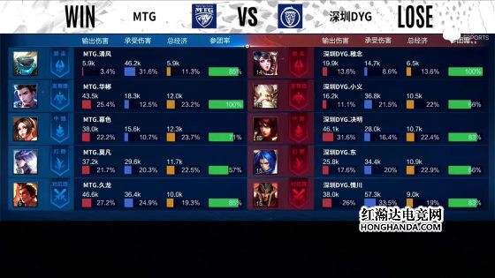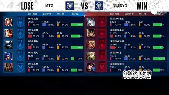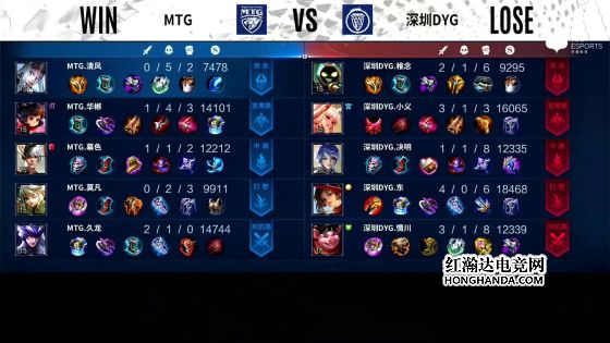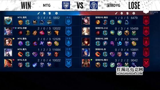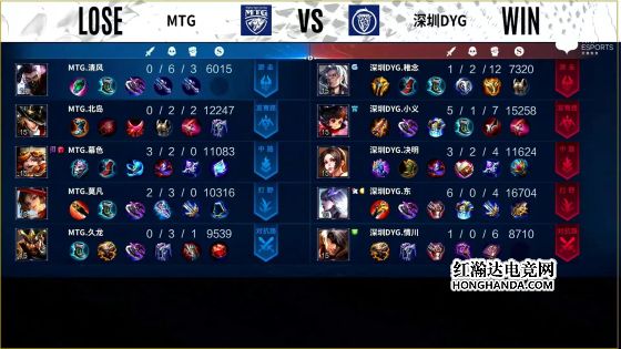11分半,阿古朵拿下暗影暴君,12分半,MTG上路高地被破,13分15秒,蒙犽拿下暗影主宰,14分半,橘右京绕后位置被发现,东皇太一开奔狼抓死橘右京,15分钟,MTG再掉中路高地,15分半,MTG三路高地全部被破,东皇太一咬中扁鹊,蒙恬拆火倒地,东皇太一二连击破,曜深入敌军后排刮残鲁班七号、刮死扁鹊,随着兵线进水晶,DYG成功推掉,战胜MTG。本局最佳给到深圳DYG.决明的沈梦溪