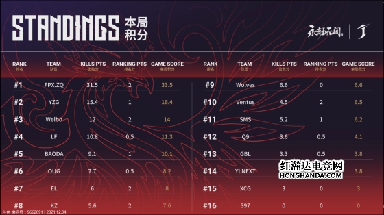 FPXZQ天海变身双抓,拉开决战序幕。SMS岳山地面收割,各队暂避其锋。由于四支队伍分别在决战城楼的不同高度,最终没有爆发生死白刃战,四支队伍都有选手存活,FPX.ZQ、YZG、Weibo、LF共同斩获荣光。