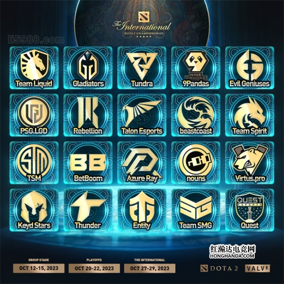 获得直邀资格的12支战队:Liquid、GG、Tundra、9Pandas、EG、PSG.LGD、SR、Talon、bc、Spirit、TSM、BB