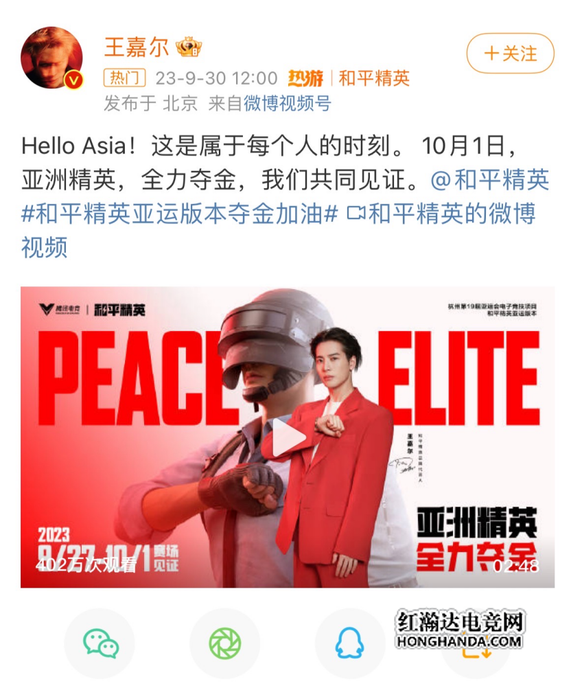 在舞台上,王嘉尔手握“中国红”旗帜,助力国家集训队出征,一起进圈为运动员们加油助威,希望他们在亚运会中可以全力以赴。在中国队成功摘得首金后,《和平精英》与王嘉尔为电竞运动员们送上真切祝福。“亚洲精英,一起上场”,这是王嘉尔与《和平精英》向外界传递的口号,一同号召大家一起“进圈”为国家集训队助威。