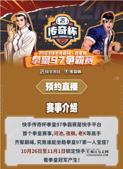 如此多的看点,大家是否已经按捺不住激动的心情,迫不及待地想要观看本次争霸赛?即日起,上快手搜索「拳皇」,即可进入赛事页面,各类赛事相关资讯一网打尽。比赛期间,观众除了观看精彩比赛,也可于10月26日-11月4日在快手带话题#传奇杯拳皇97争霸赛 发布赛事相关视频,赢取万元奖金。