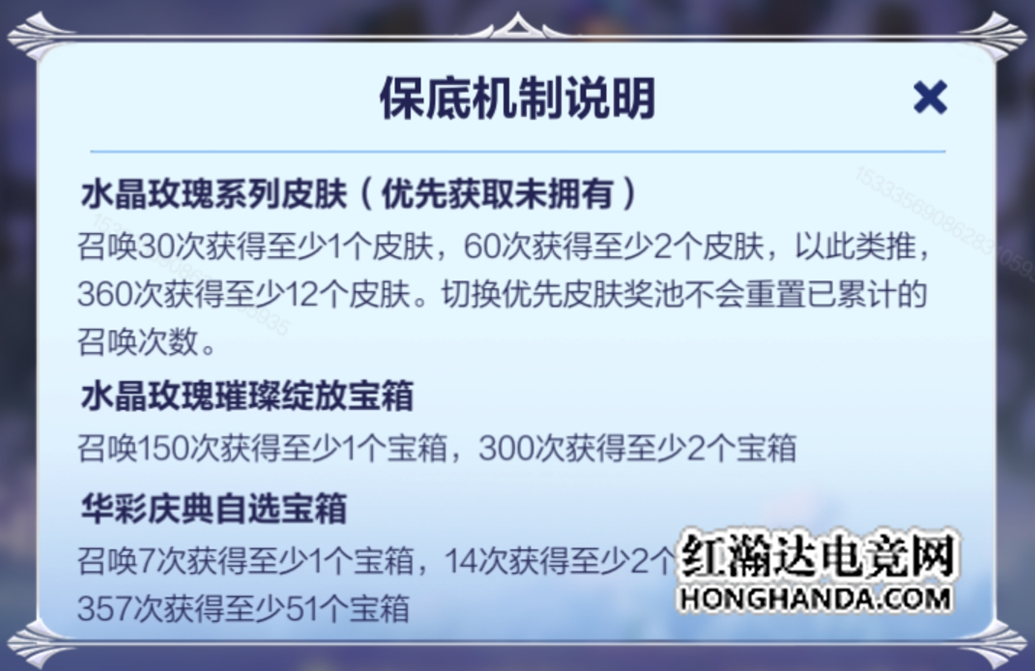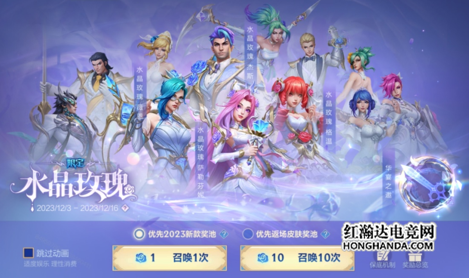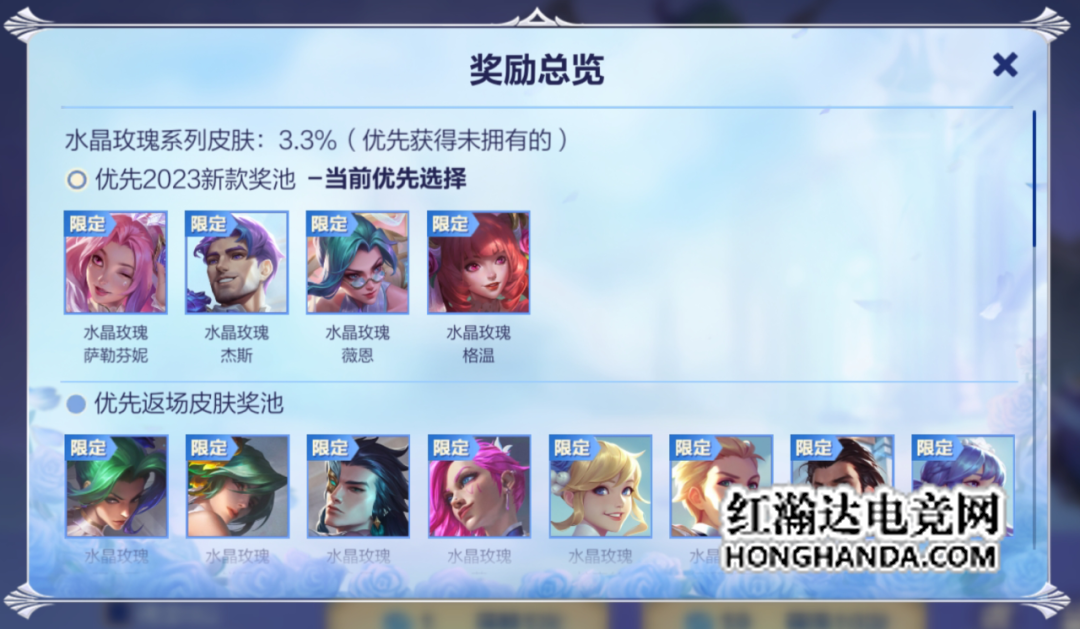 本次上线的水晶玫瑰系列皮肤共有12个,玩家们可在主界面选择优先获取的皮肤奖池范围,获取皮肤时优先获取当前皮肤奖池未拥有的皮肤,活动初始默认优先奖池为2023新款奖池。当已拥有所选奖池的所有皮肤时,下次召唤起会优先获得其他未拥有的水晶玫瑰皮肤。