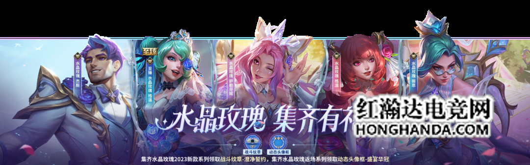 准备All in水晶玫瑰2023新款系列皮肤的玩家,还可以【在个人信息的收藏指南中】领取战斗纹章“澄净誓约”,集齐水晶玫瑰返场系列皮肤还能领取动态头像框“盛宴华冠”,向游戏内的伙伴展示自己的华丽典藏!