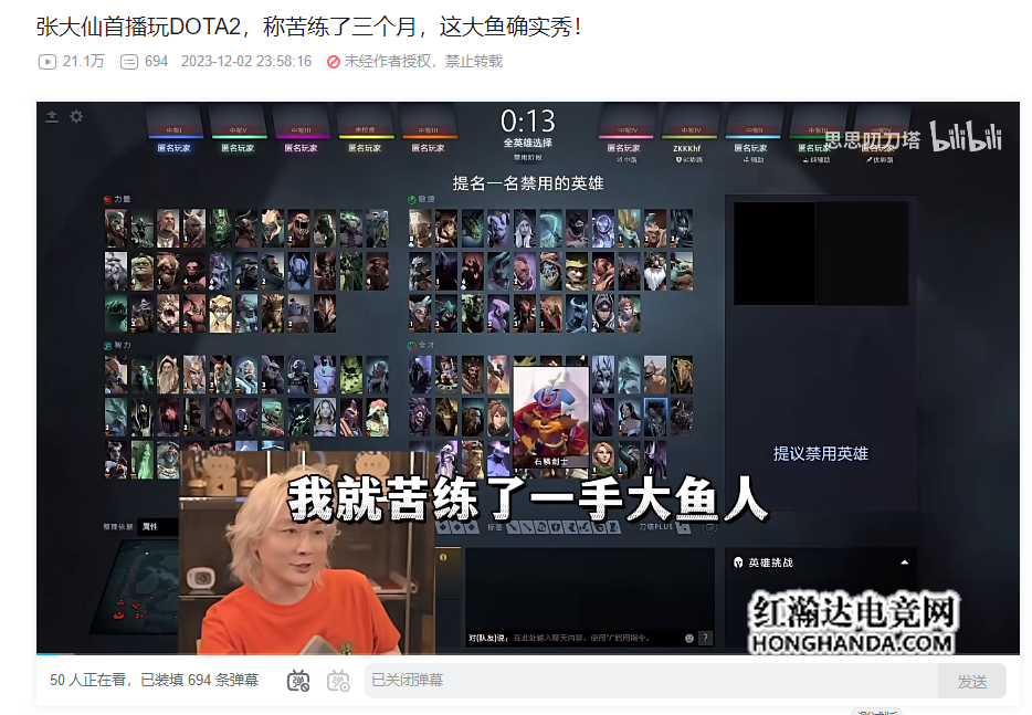 于是在百万在线观众的面前秀了一把“苦练许久”的大鱼人,而在直播中,更是给王者的观众和刀塔的观众都来了一点震撼,王者的观众惊讶于张大仙在短短几个月里为何进步如此神速,明明之前都一直在打王者,而刀塔的观众也是惊讶于居然有如此口条清晰,同时兼顾文明和直播效果的主播,甚至称张大仙的直播是可以在家公屏放的。在这样的双重震撼下,也许能看出张大仙这么多年来一直稳居直播一线的秘密。