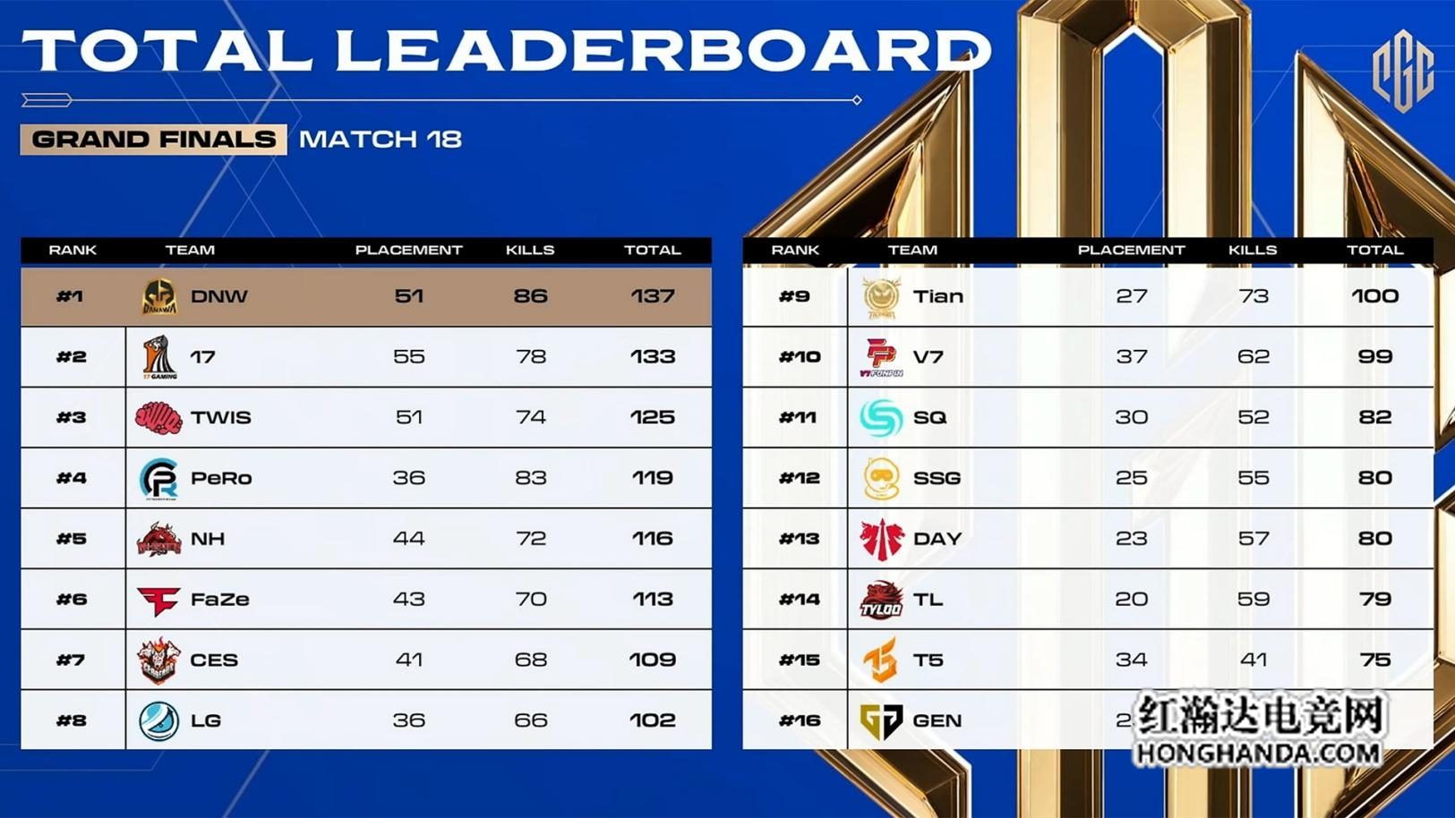 在PGC 2023总决赛中,DNW在第一天的比赛中仅在第11位止步不前,但在第二天仅仅通过一天的时间就足足获得70分后一举登上榜首。在比赛过程中,DNW展现出了长线的作战能力和稳定的运营能力。特别是在成为分水岭的16局维寒迪地图中,DNW与来自中国的战队PeRo展开了最后的竞技并成功吃鸡。最终以18场比赛137分的成绩获得了冠军。