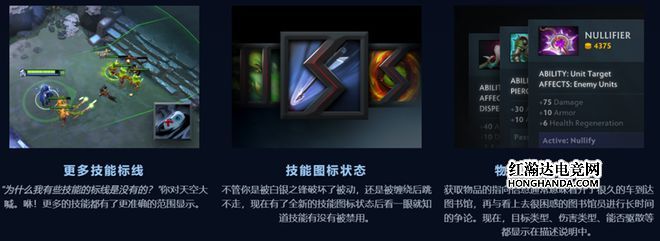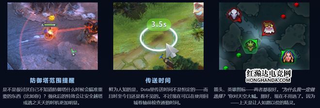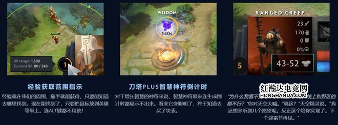 本次更新客户端优化了诸多信息提示,包括防御塔范围提醒、传送时间、小地图图标、更多技能标线、技能图标状态、物品描述说明优化、经验获取范围指示、刀塔PLUS智慧神符倒计时、小兵赏金等。