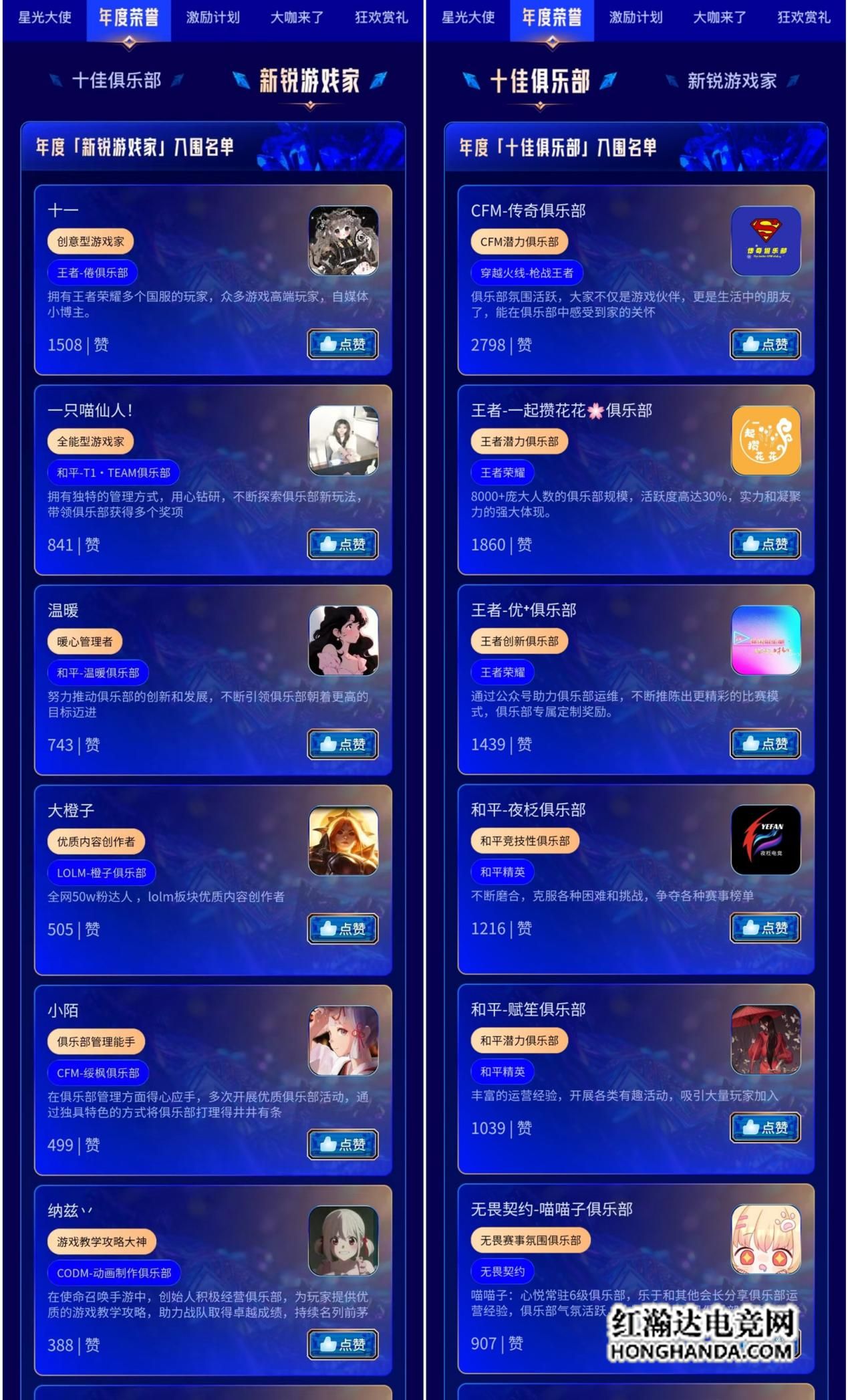 「年度十佳俱乐部」、「年度新锐游戏家」是今年的重磅奖项,将由“星光大使”、行业媒体和玩家共同评选。游戏用户点赞入口将于2024年1月10日15:00关闭,想为你所支持的俱乐部和新锐游戏家加油的话,就赶快去为他们点个赞吧!