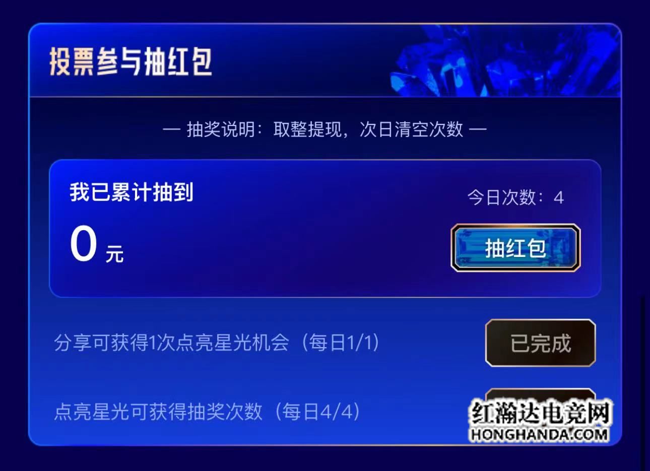 单账号每日进入活动页面可获得3张点亮星光的票数,分享获得可额外获得1张。每成功点亮1次星光,都可获得1次抽取现金红包的机会,次日0:00清空。到活动结束后,将以活动期间累计的红包金额取整提现。大家在为喜爱的游戏家投票时不要忘了抽红包哦,每日都有机会中奖,多抽多得!