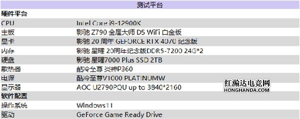 正式进入测试环节,本次测试平台处理器采用Intel Core i9-12900k,搭配影驰 Z790 金属大师 D5 WiFi 白金版,内存采用影驰 星曜 20周年纪念版DDR5-7200 24G*2内存条;固态采用的是影驰 星曜7000 Plus SSD 2TB。PCIe4.0 固态的超高读写速度搭配超高性能的配置让影驰 20 周年 GeForce RTX 4070 纪念版的出彩性能在测试中拥有一个完整的呈现。