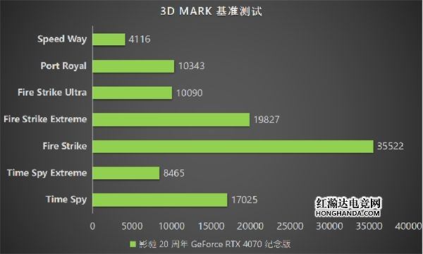 通过数据可以得到,在3DMark TimeSpy DX12测,影驰 20 周年 GeForce RTX 4070 纪念版 的显卡分数达到了17025分。在3DMark Fire Strike DX11测试中,影驰 20 周年 GeForce RTX 4070 纪念版 的显卡分数为35522分。其性能能让玩家流畅运行市面上的大多数游戏,实现高刷新率的需求。而在3DMark Portal Royal光追测试中,影驰 20 周年 GeForce RTX 4070 纪念版的分数达到了10343的高分。即意味着该卡在进行3A光追游戏大作时的性能体现。