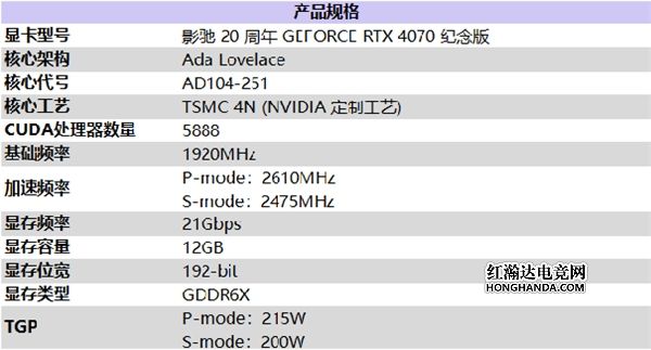影驰 20 周年 GeForce RTX 4070 纪念版 采用GeForce RTX 40系列全新一代NVIDIA Ada Lovelace 架构核心,核心处理器型号为AD104-251。作为ADA架构的旗舰型号,能为玩家提供顶级性能,可让游戏玩家和创作者在性能、AI 驱动图形领域以及其他领先的平台功能上实现质的飞跃,其提供的体验穿越速度,不止于快。换句话说,该卡游戏性能相比 GeForce RTX 3070Ti 提升 20%,其独有的NVIDIA DLSS 3 技术下提升 70%。该架构配备了第三代 RT Core 和第四代 Tensor Core,以及支持NVIDIA DLSS 3.5技术,其中包含超分辨率、DLAA、帧生成、光线重建等技术,让玩家们在游戏时能够完美的感受技术与性能的震撼,感受精美的画面的同时拥有高帧流畅体验。影驰 20 周年 GeForce RTX 4070 纪念版基础频率为1920MHz,而在影驰 20 周年 GeForce RTX 4070 纪念版 所配备的DUAL BIOS 一键切换功能下,能轻松实现P-mode & S-mode双应用场景。在S-Mode 标准模式下频率达到2475MHz,在P-Mode 性能模式下则是高达2610MHz,一键超频带来更强的性能!