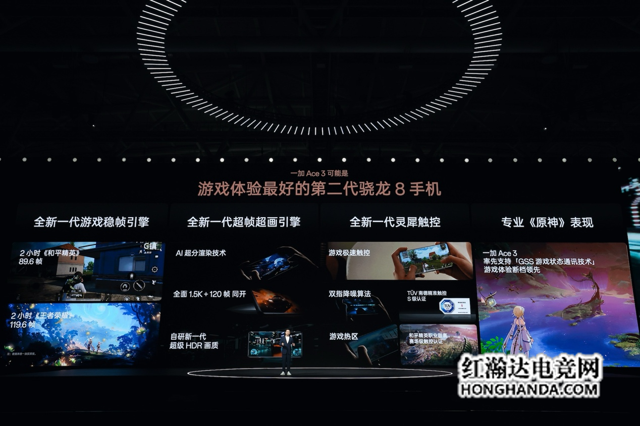 一加 Ace 3 搭载独显芯片,配合全新一代「游戏稳帧引擎」、「超帧超画引擎」与「灵犀触控」,可针对游戏指令进行资源合理化重新分配,提升图形渲染效率,实现了所有游戏 120 帧超帧和 1.5K 超级分辨率同开,达成了双指百万次 0 断触,普及了新一代自研超级 HDR 画质,为游戏玩家带来长时间的流畅满帧、清晰自然的游戏画质与多手指跟手稳定。