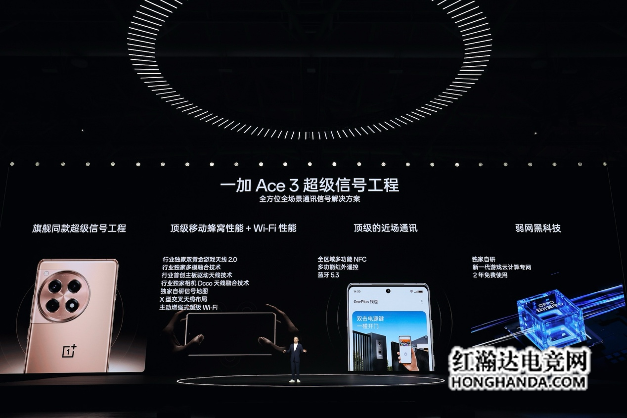 一加 Ace 3 配备行业独家双黄金游戏天线 2.0,支持行业独家多模融合技术、主板驱动天线技术,并首创相机 Deco 天线融合技术,配合 X 型交叉天线布局,手机信号大幅增强;一加 Ace 3 搭载独家自研「主动增强式超级Wi-Fi」,功率比上代增大一倍,并通过防丢包、抗干扰等智能调度,全方位提升 Wi-Fi 日常使用体验。