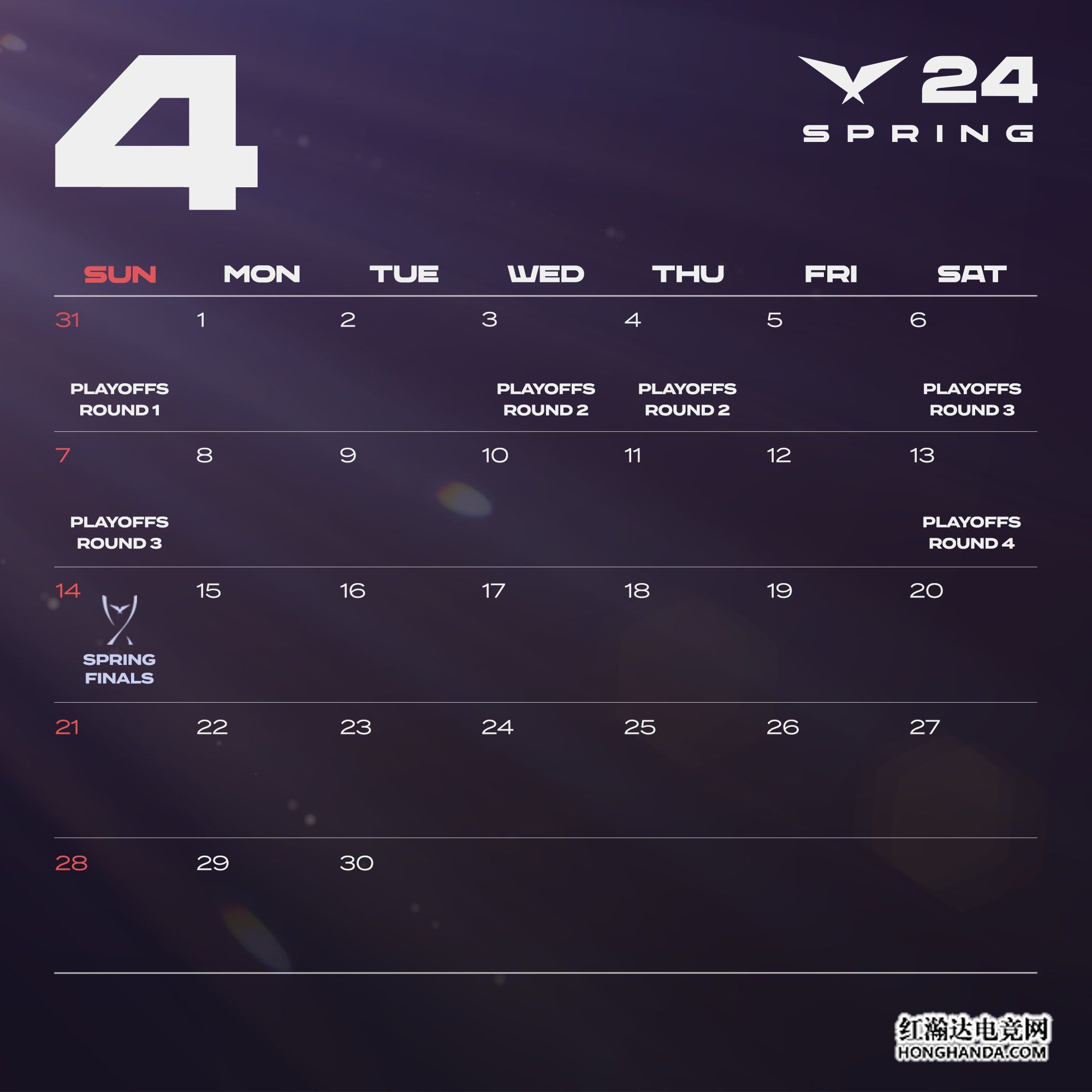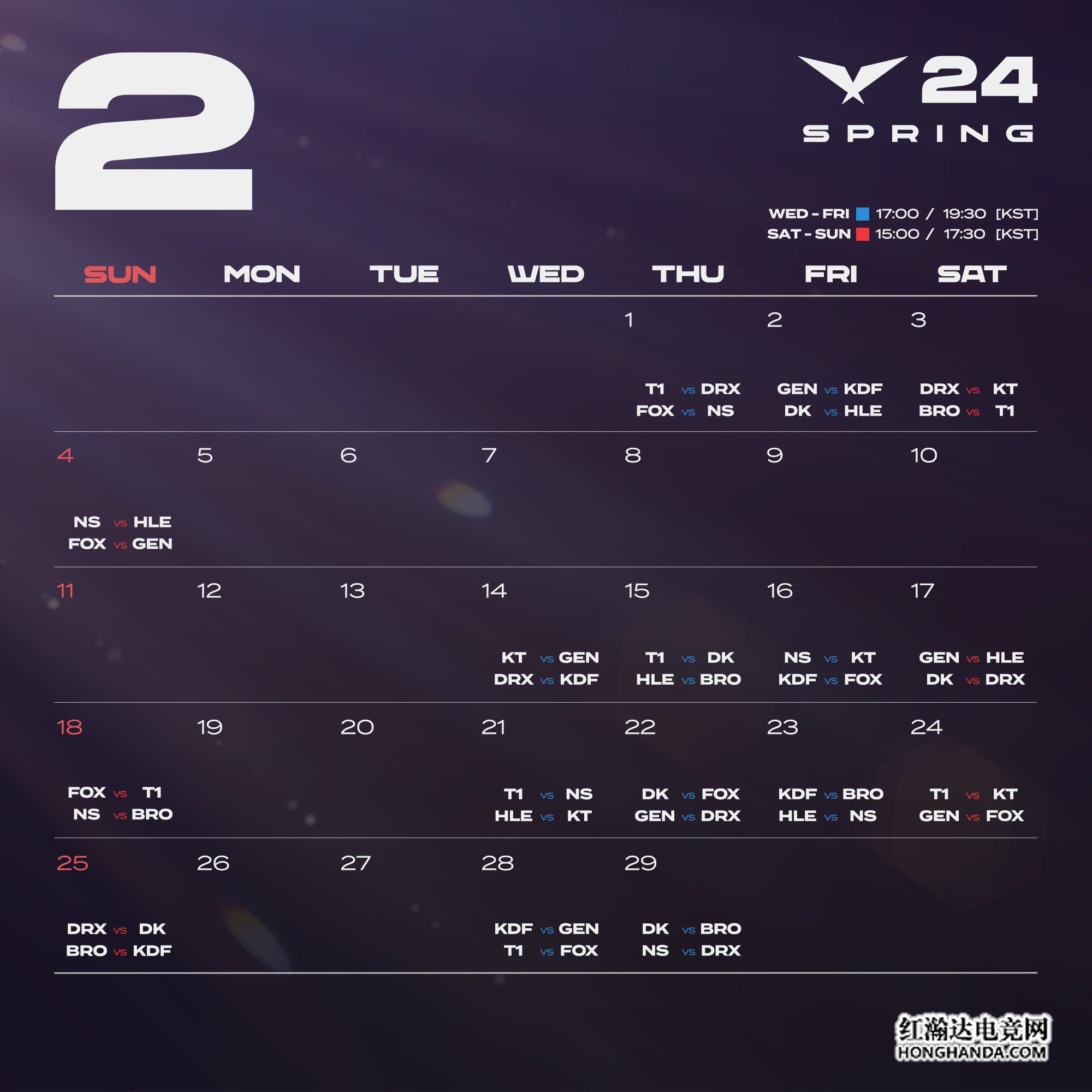 LCK春季赛常规赛每周三至周日,每天两场比赛。LCK春季赛季后赛将于3月30日开始,决赛在4月14日举办。