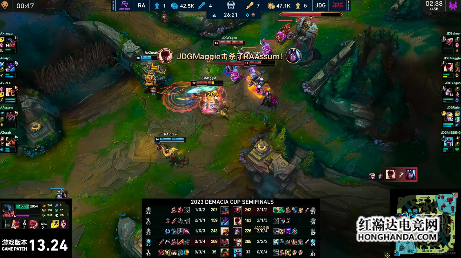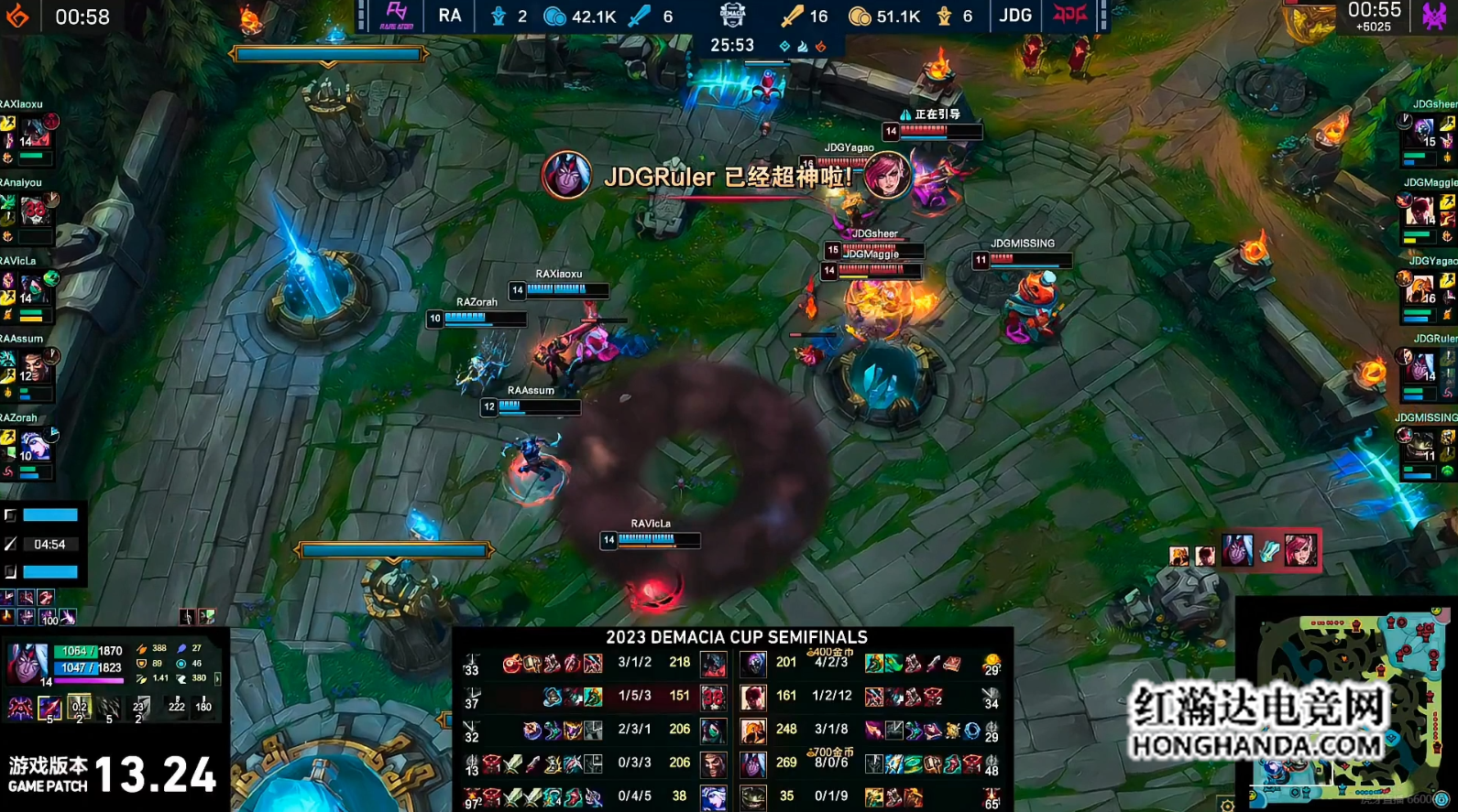 JDG 27分钟拿下火龙魂,此时Ruler韦鲁斯也8-0-6成为RA最为头疼点之一。JDG也是稳步向前,在高地上将RA团灭,在高地上团灭RA拿下第一局比赛。