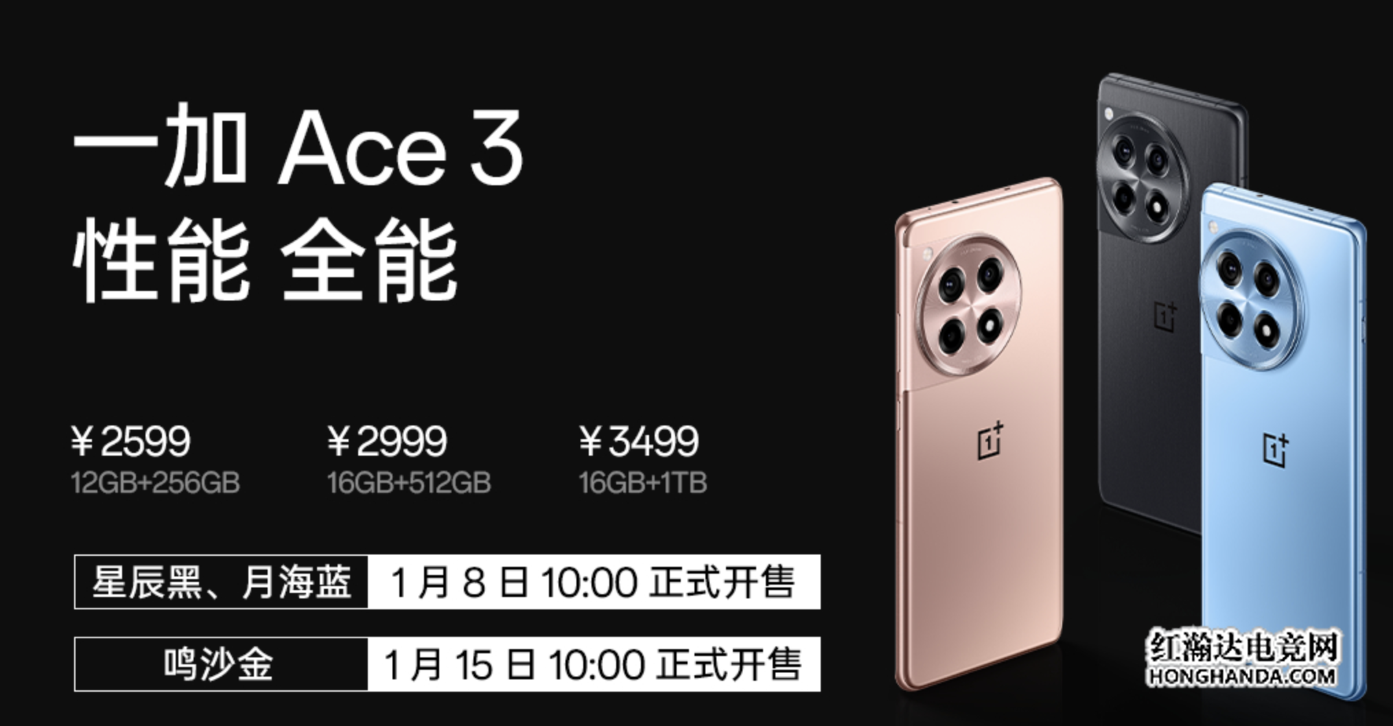 一加持续秉持「产品力优先」理念,让旗舰性能的全面普及,既有强大的产品力,也有极具诚意的价格。一加 Ace 3 星辰黑和月海蓝配色将于 1 月 8 日 10:00 正式开售,鸣沙金配色将于 1 月 15 日 10:00 正式开售,12GB+256GB 版本售价 2599 元,16GB+512GB 版本售价 2999 元,16GB+1TB 版本售价 3499 元。