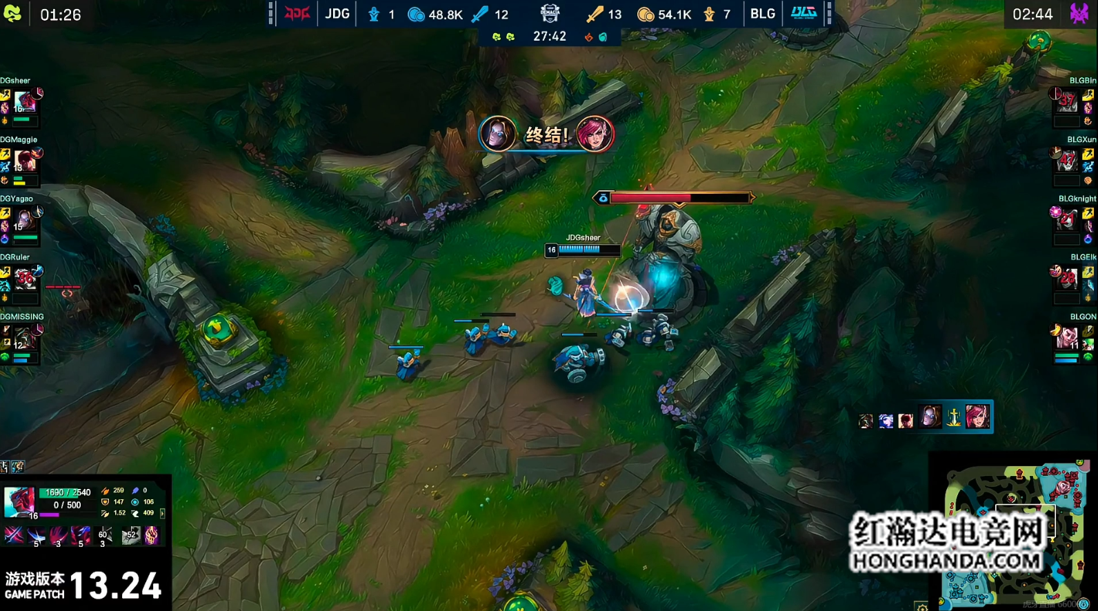 比赛16分钟中路的一波混战,让BLG打出1换4。JDG前期稳住的局面彻底崩盘,BLG的进攻脚步开始加快,用二先锋在19分钟就拆掉JDG上路高地防御塔。JDG最肥的Yagao发条也被BLG抓单击杀,支撑JDG拖后期的唯一依靠也蹦了。